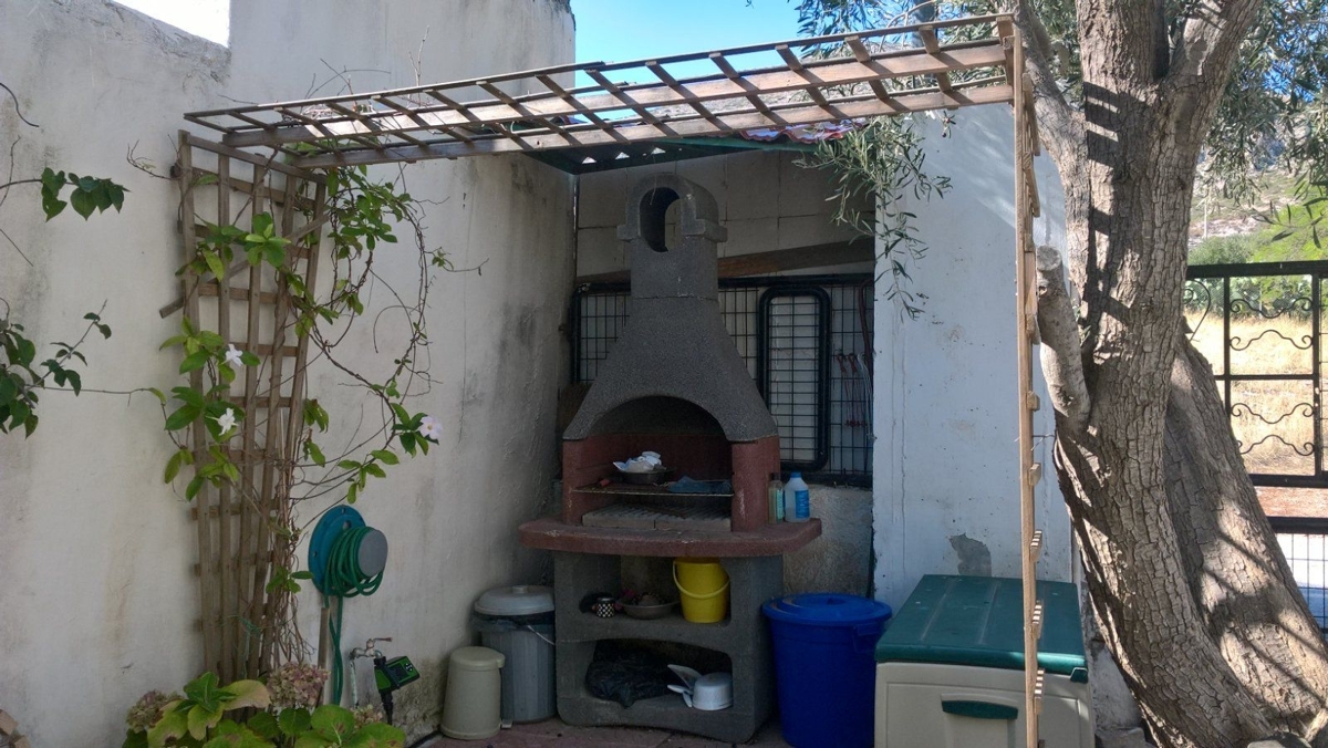 Rechts vom Tor befindet sich eine gepflasterte Terrasse mit fester Sitzgelegenheit und ein gemauerter Grill.