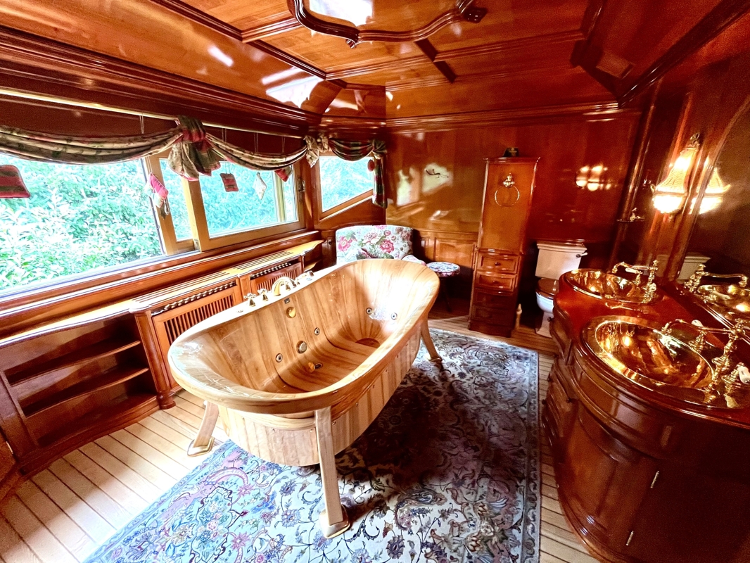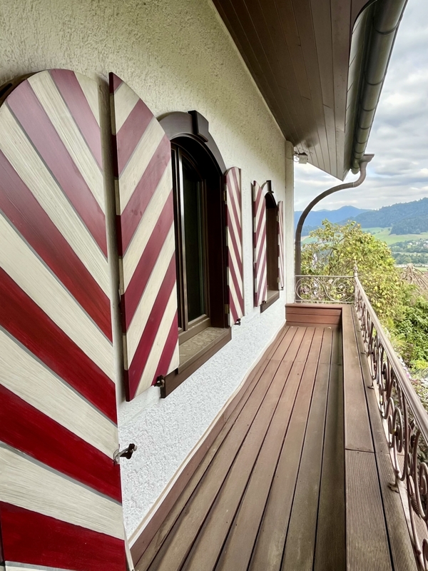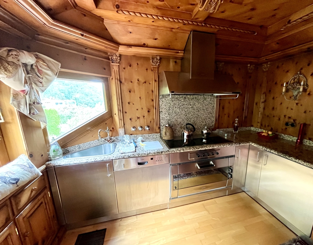 Im Obergeschoß erwartet uns die gemütliche Wohnküche mit hochwertigen Zirbenkiefer Holz ausgestattet, das Bad mit seiner extravaganten Ausstattung, die Badewanne aus Holz mit Whirlpool Funktion, eine absolute Rarität. Die zwei Zimmer haben jeweils eine Loggia, die bieten einen traumhaften Ausblick und haben jeweils einen verschließbare Abstellkammer. Ein Treppenlift ist auch vorhanden und hier haben wir ca. 82 m² Wohnfläche, Einbauküche mit Edelstahlküchenfront, Einbauschränke in Massivholz sind nur einige Highlights.