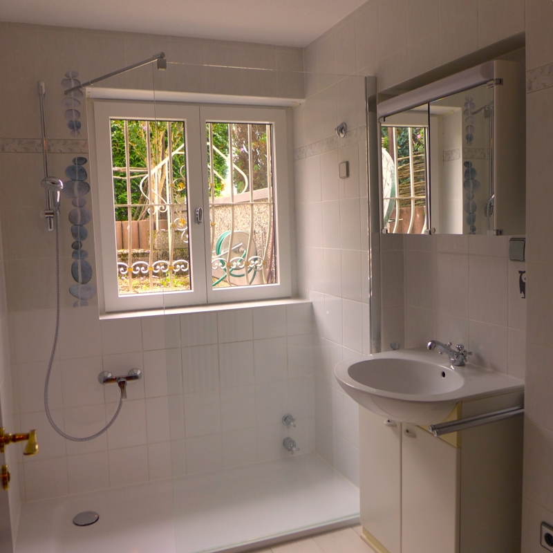 Das Wohnzimmer mit seiner großen Sicherheit verglasten Schiebetürfront zur Terrasse, eine fast neuwertige Einbauküche, das Bad mit einer begehbaren Dusche und Waschbecken, sowie ein Gäste WC. Die UG und EG -Wohnungen sind im besonderen Umfang ( Fenster und Türen) besichert.