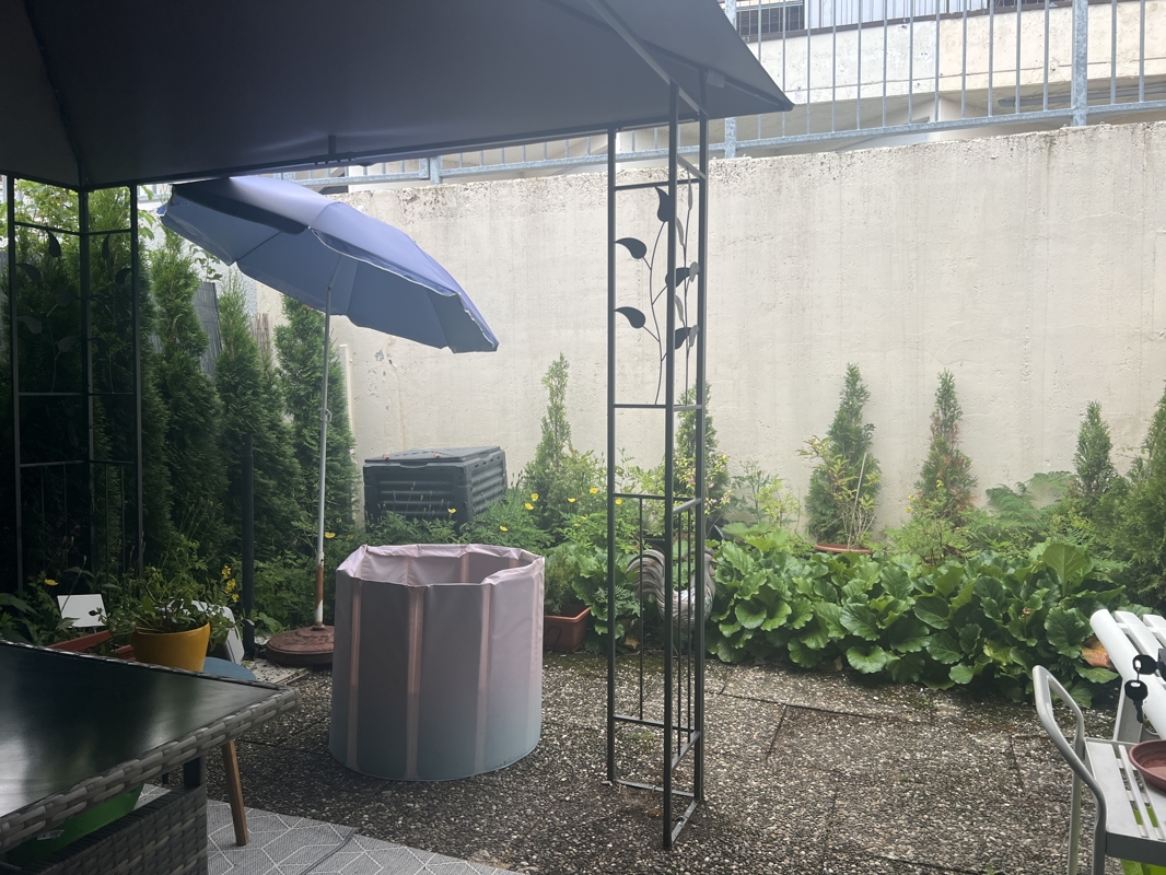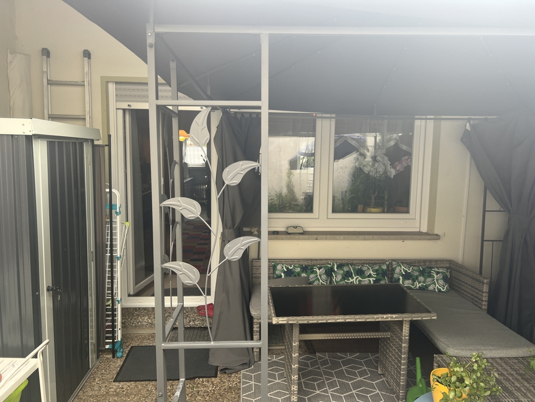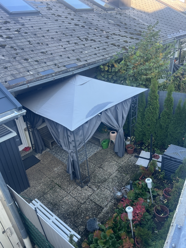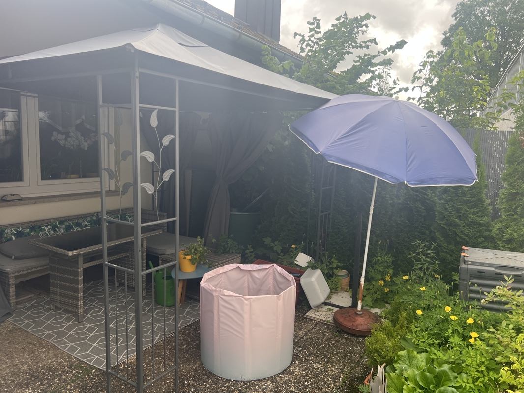 Im OG: TERRASSE: Wunderschöne große geräumige und mit einem gemütlichen Pavillon überdachte Terrasse auf der rückwärtigen Seite des Hauses mit Blick in die grüne Garten Oase voll blühender Pflanzen, Hecken und Sträucher ideal zum Verweilen, Frühstücken, Gärtnern und Feste feiern etc.