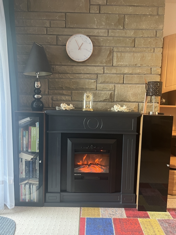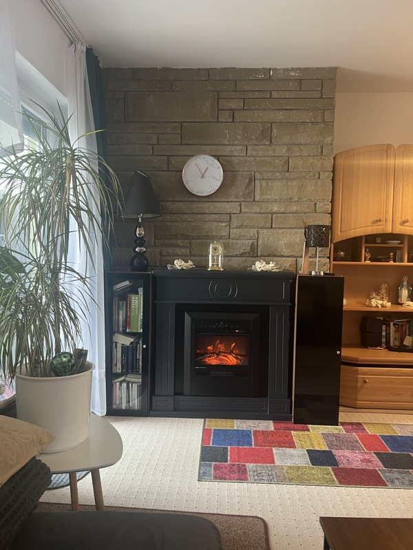 Im OG: Wohnzimmer mit gemütlichem Elektrokamin oder alternativ auch schön wärmender Holzkamin nutzbar für tolle Stunden voller Lagerfeuerromantik